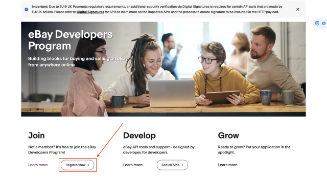 APIを利用するには、eBay developer programでデベロッパーアカウント登録をする必要があります。